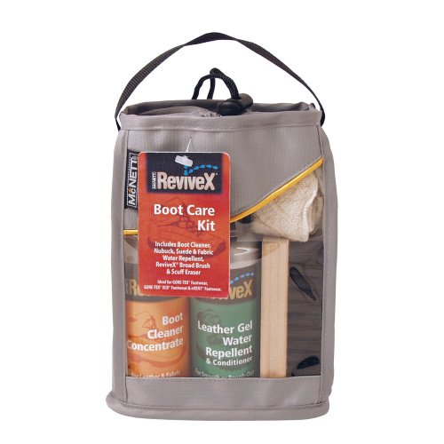 ReviveX Leather Boot Care Kit includes ReviveX Leather Gel Water Repellent & Conditioner, ReviveX Boot Cleaner Concentrate, ReviveX Broad Brush and Gel Application Cloth. Cleaner and specialized heavy-duty gel formula for full-grain leather boots. Designed for footwear worn in the most abrasive trekking conditions. Note: This gel formula may darken and slightly smooth the Knapp (rough out) finish on suede and nubuck. McNett customer care @ 1-800-221-7325 (or) www.mcnett.com .
