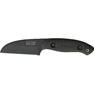 Product Description : SCAR Blades - Black Finish Hawkeye Fixed Blade Knife with Black Handles. Model: SCAR041. 8 1/8" overall. 3 3/8" black finish blade. Full tang. Black handle. Black sheath. SCAR Blades are custom hand built knives produced in the U.S.A. They are designed to be used as rugged tools to assist military, law enforcement, and avid outdoorsmen to survive in the field, even in the most harsh conditions. Most SCAR Blades knives are full tang and are made from 3/16" thick 1095 high carbon alloy, which is heat treated for hardness only along the sharpened edge - creating a RC hardness of 58, while leaving the spine of the blade softer to absorb the stresses of high impact chopping. Blades have a powder coated finish and come with a non-slip phenolic handle to ensure a sure grip. Sheaths are individually made using Kydex, which is tightly formed around each individual knife for a secure fit. The sheaths are equipped with either a rotating belt loop allowing the sheath to swivel 360 degrees, moving with the user or a stationary loop for added strength and security. Multi-attachment holes are located around the sheath, to allow the knife to be adjusted and placed anywhere the user requires.