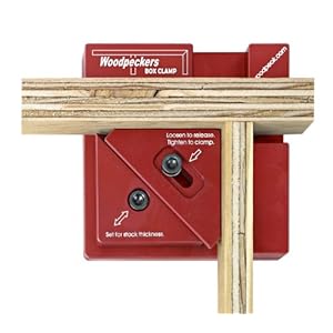 Product Description : You can never have enough clamps. But then again, having just the right clamp for the job can make a huge difference. The new Woodpecker 4" Box Clamp might just be the perfect clamp for assembling your cabinets, drawers and virtually any other box made from ?" to 1" thick material even with two pieces of different thickness (up to 1/4" difference). It's unique space-saving design actually gives you more surface area then most similar corner clamps while not having any clumsy, protruding handles or screws. The Box Clamp was designed to take up the least amount of space while offering more, dead-true clamping surface then other comparable clamps. It can be used as part of a clamping fixture for assembly of multiple, identical assemblies or un-fixtured for large cumbersome projects. Most mass produced clamps are stamped, molded or die-cast distant cousins from the precise proto-types they started out as. Not here. We carefully machine each and every clamp from a solid billet of stress-relieved aluminum to ensure dead-square accuracy in each and every direction so every clamp is as perfect as the last one. You'll find the Woodpecker Box Clamp to be at least as precise as your high-end layout square and robust enough to deliver a lifetime of consist reliable service. The secret to it's compact functionality is it's tapered wedge design, (only one moving part), that simultaneously pushes the mating materials down and in with less then two turns of the screw while applying an enormous amount of clamping force. Even just one Box Clamp will save you time and aggravation as it instantly squares up your pieces and holds them in place for gluing, screwing or nailing.