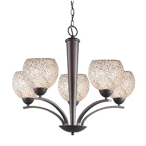 Product Description : From the ManufacturerWith a variation of beautiful art glass combined with clean lines and a transitional design, the North Bay collection offers your room the enhanced style and decor it is looking for. This collection includes a 3-light chandelier, this 5-light chandelier, a 1-light mini-pendant, a 1-light wall sconce, and a 3-light bath bar. Product Description : Bring your home a touch of elegance with North Bay Chandelier by Woodbridge Lighting. Artfully crafted in White Mosaic and Metallic Bronze finish this piece is the perfect contemporary style addition to any room. Item Dimensions (inches): 23.5Hx26W(D) Wattage: 60W Number of bulbs: 5 Wire Length (inches): 120 Chain length (inches): 72